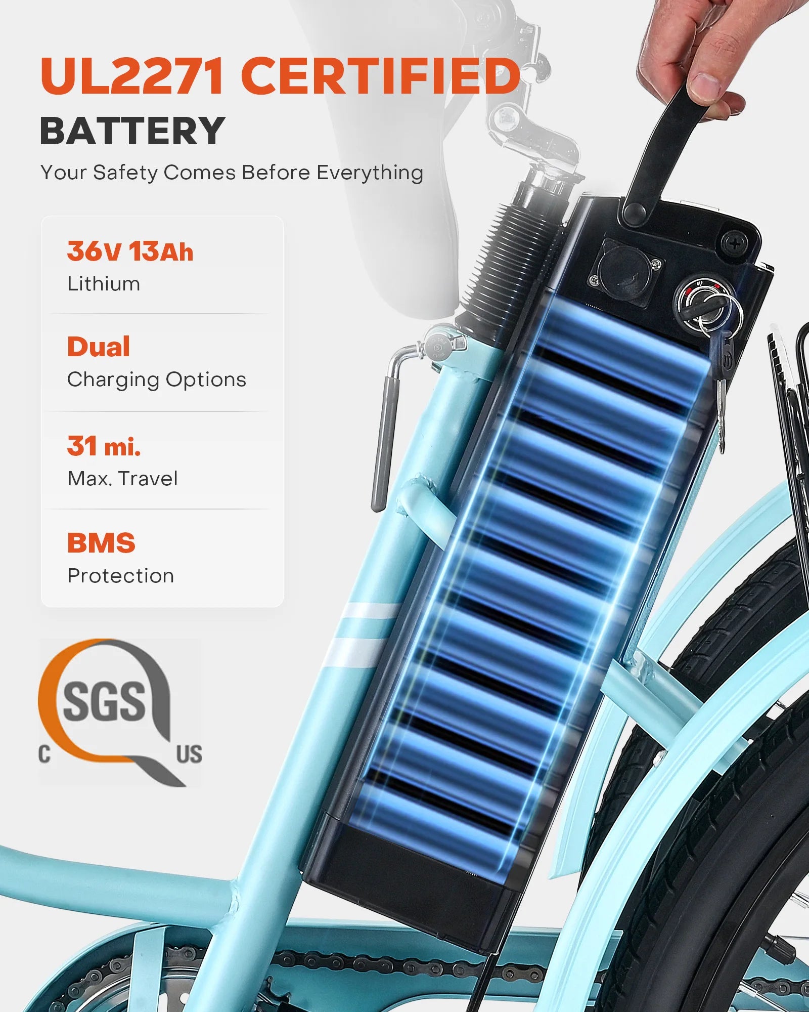 - Long-lasting battery 36V 13Ah Lithium power source delivers dependable performance on longer trips.