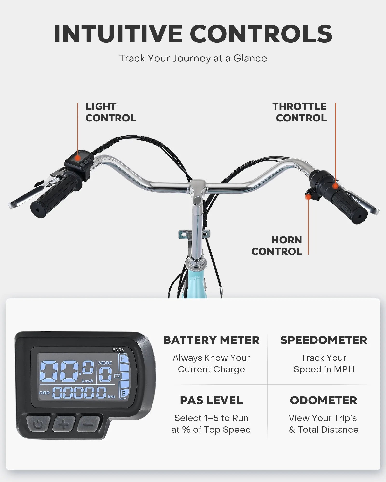 - Powerful 250W motor provides steady acceleration and confident hill climbing for urban and suburban terrain.