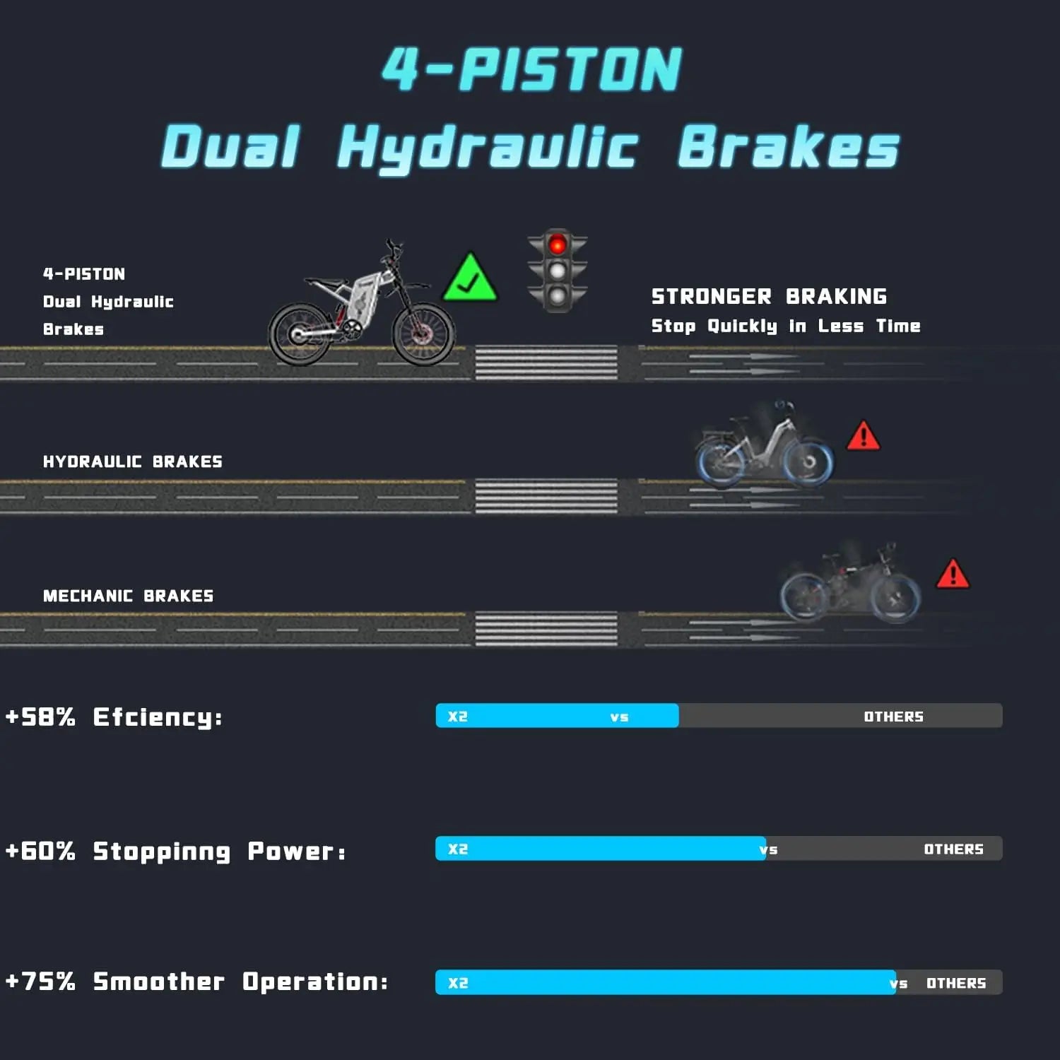 Freego X2 Pro Electric Ebike is engineered for off-road dominance and everyday versatility. When you crave rugged trails or high-speed sprints, this e-bike delivers with a powerful 6000W peak brushless motor, a robust 60V 30Ah lithium battery, and precise hydraulic disc braking for confident stopping in all conditions.