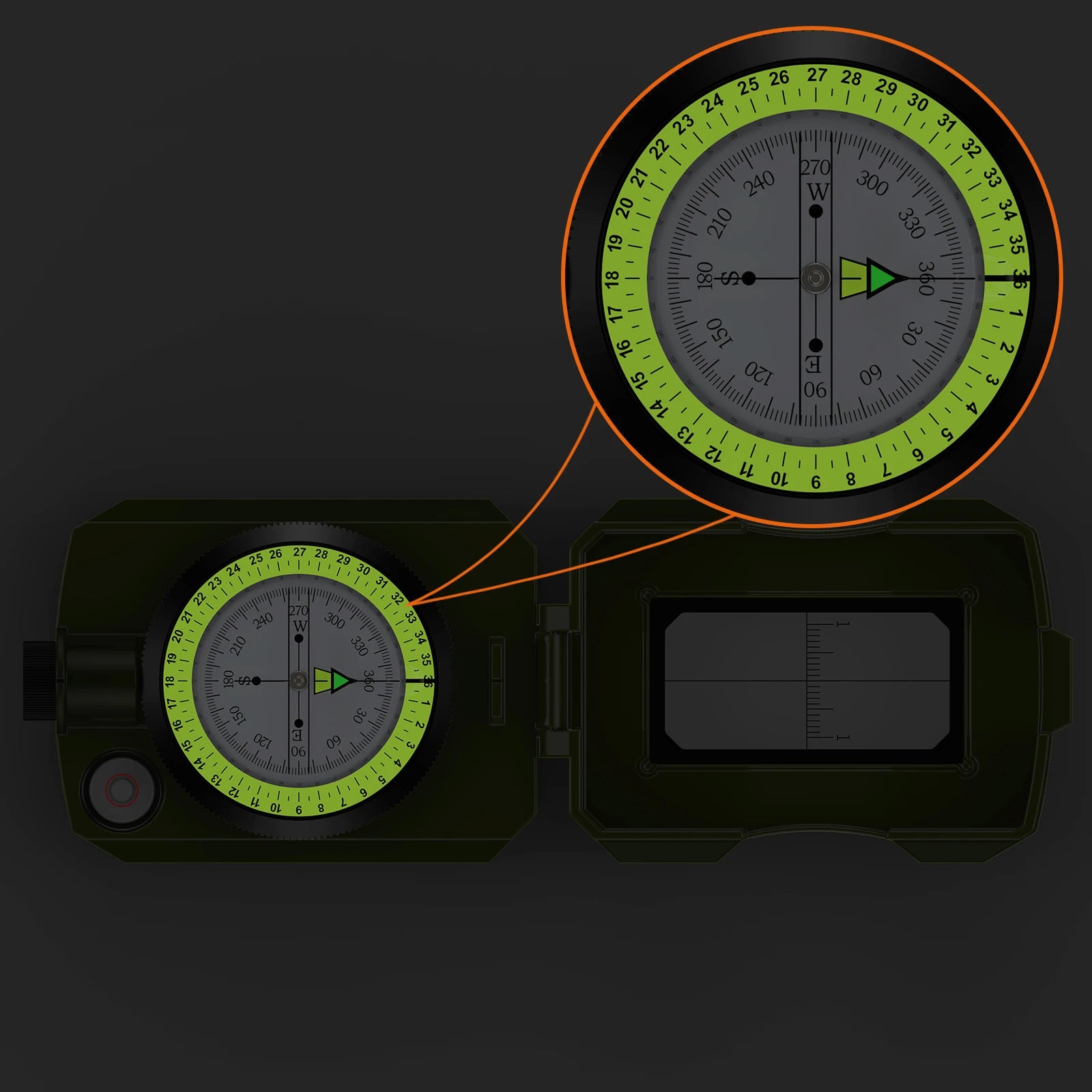- 360° dial with adjustable prism lens: foldable metal cover and a floating dial ensure precise bearings from any angle, with a clear 360° scale.