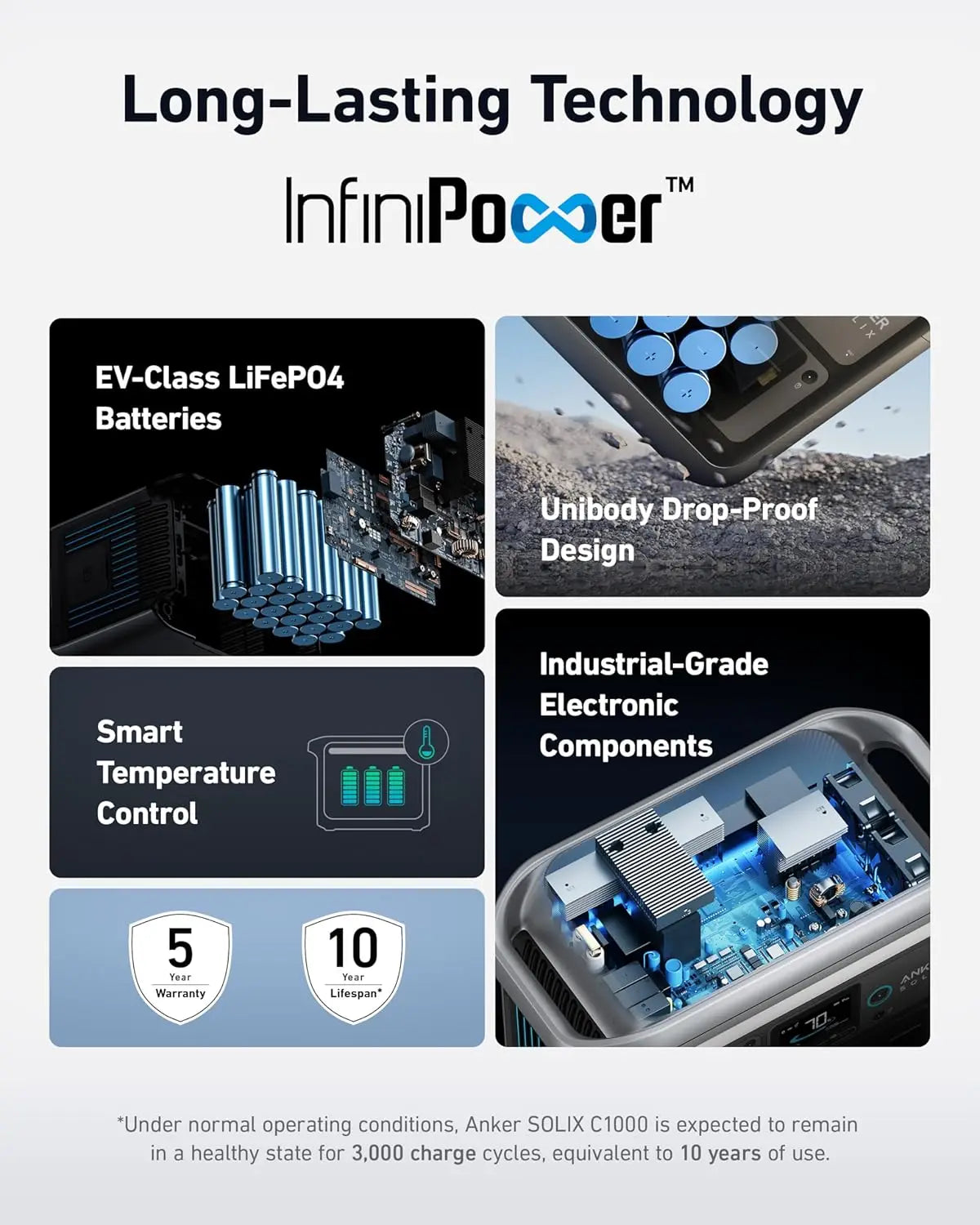 Whether you’re safeguarding a home during outages or chasing outdoor adventures, the SOLIX C1000 keeps essential devices powered—phones, lights, small appliances, and more—without noise or fumes. The LiFePO4 chemistry offers a longer cycle life and enhanced safety, making it a smart, dependable choice for everyday use and emergencies alike.